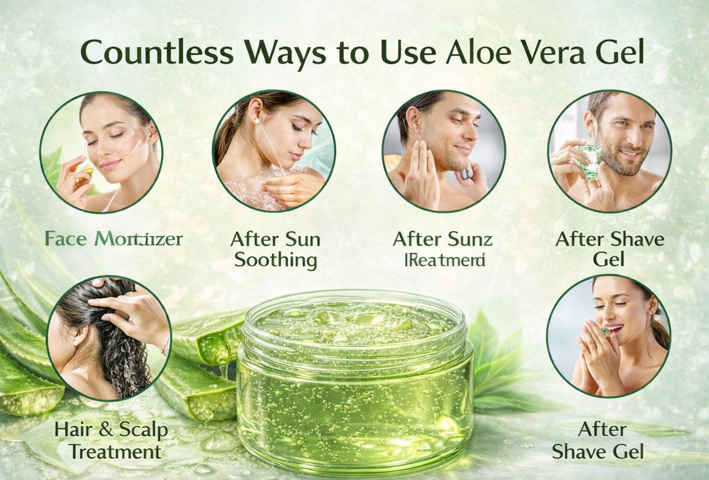 Promotional graphic showing various uses of aloe vera gel with images of people applying it.